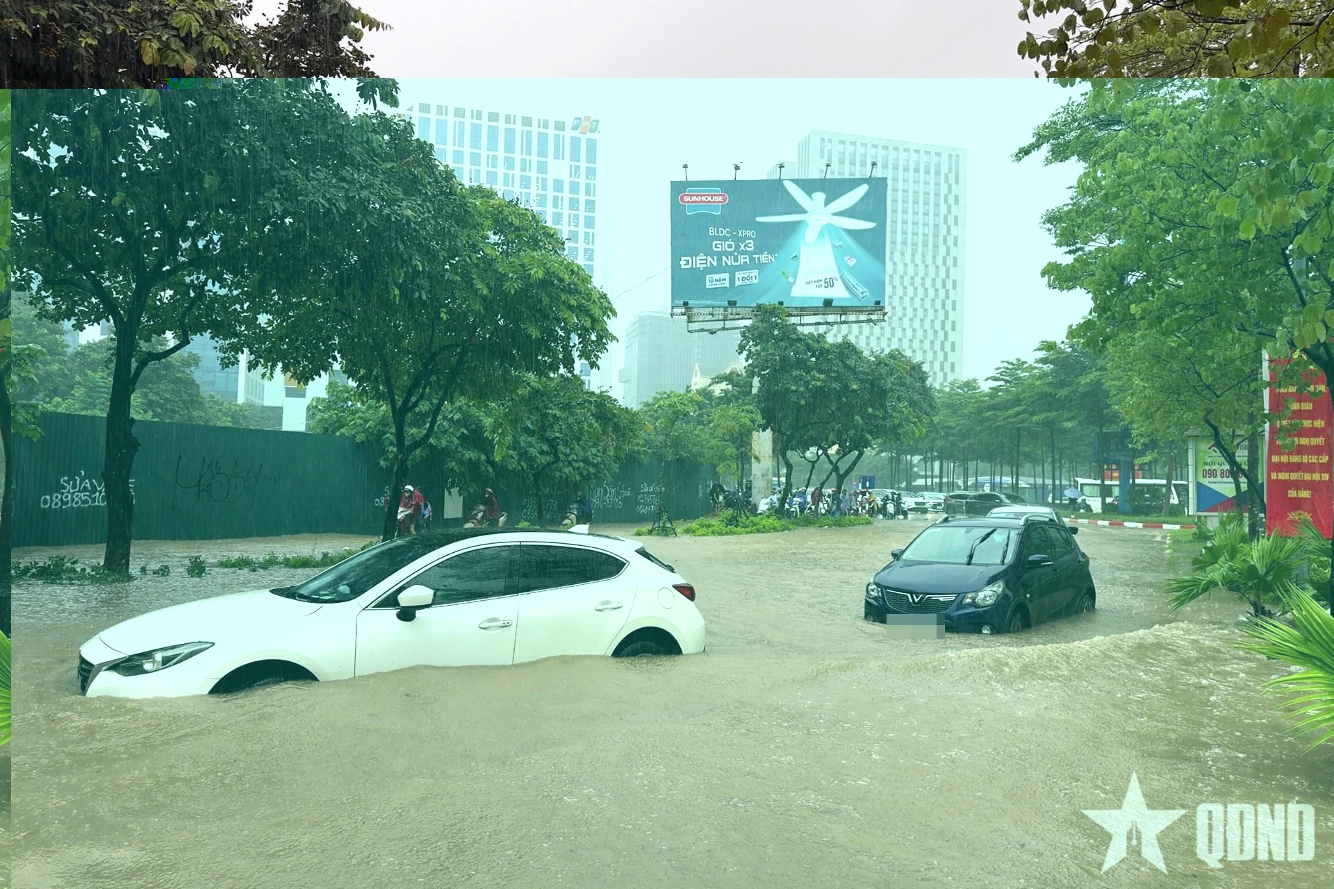 | Đường Trần Thái Tông - Cầu Giấy ngập sâu nhiều xe ô tô chết máy. Ảnh Tiến Tuấn |