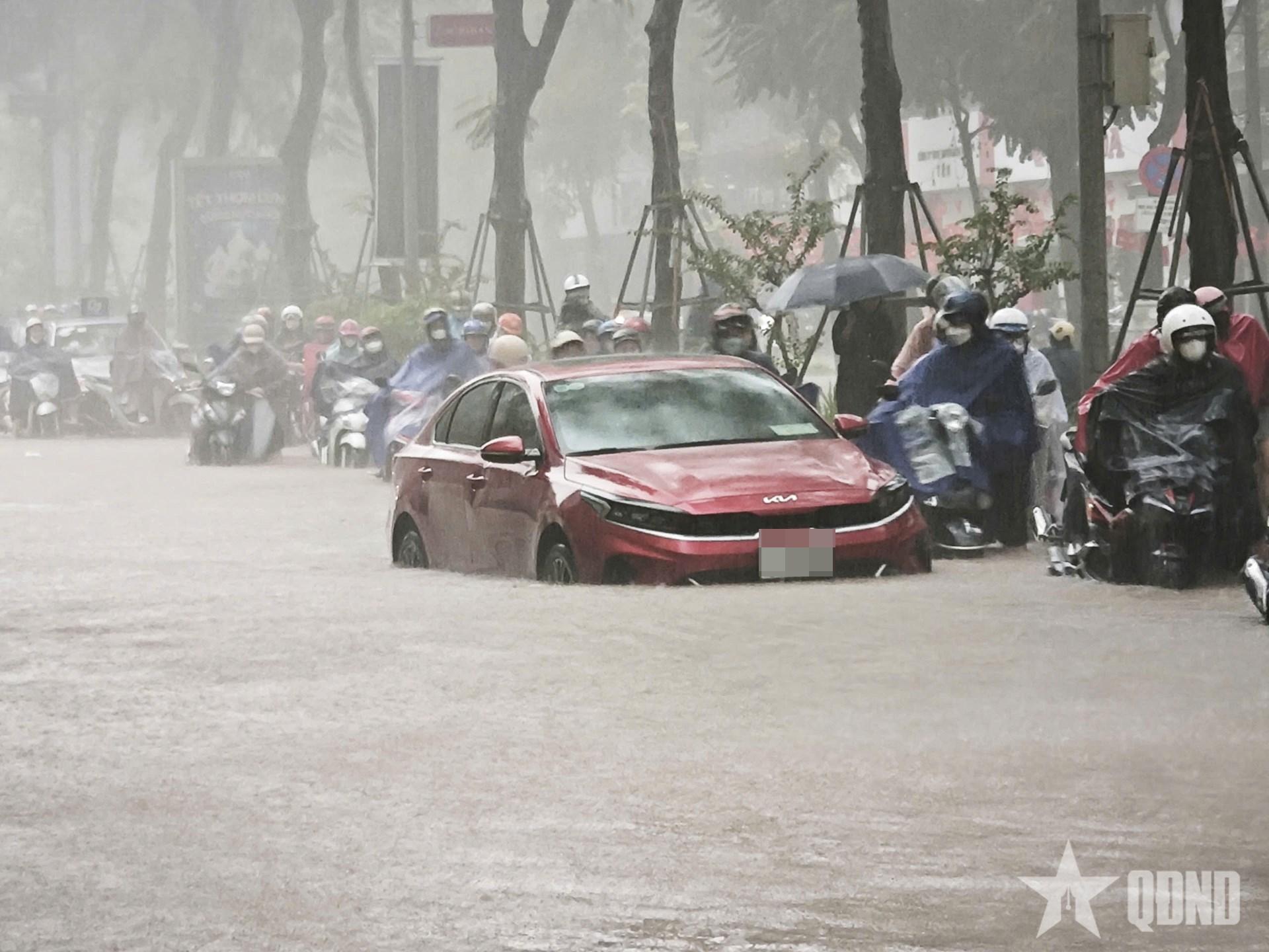 Tuyến Huỳnh Thúc Kháng (đoạn từ Nguyễn Chí Thanh đến Thái Hà) do bị ngập sâu có vị trí ngập 30cm và trên 30cm, 1 số xe ô tô đã bị chết máy. Ảnh: PHẠM HƯNG |
