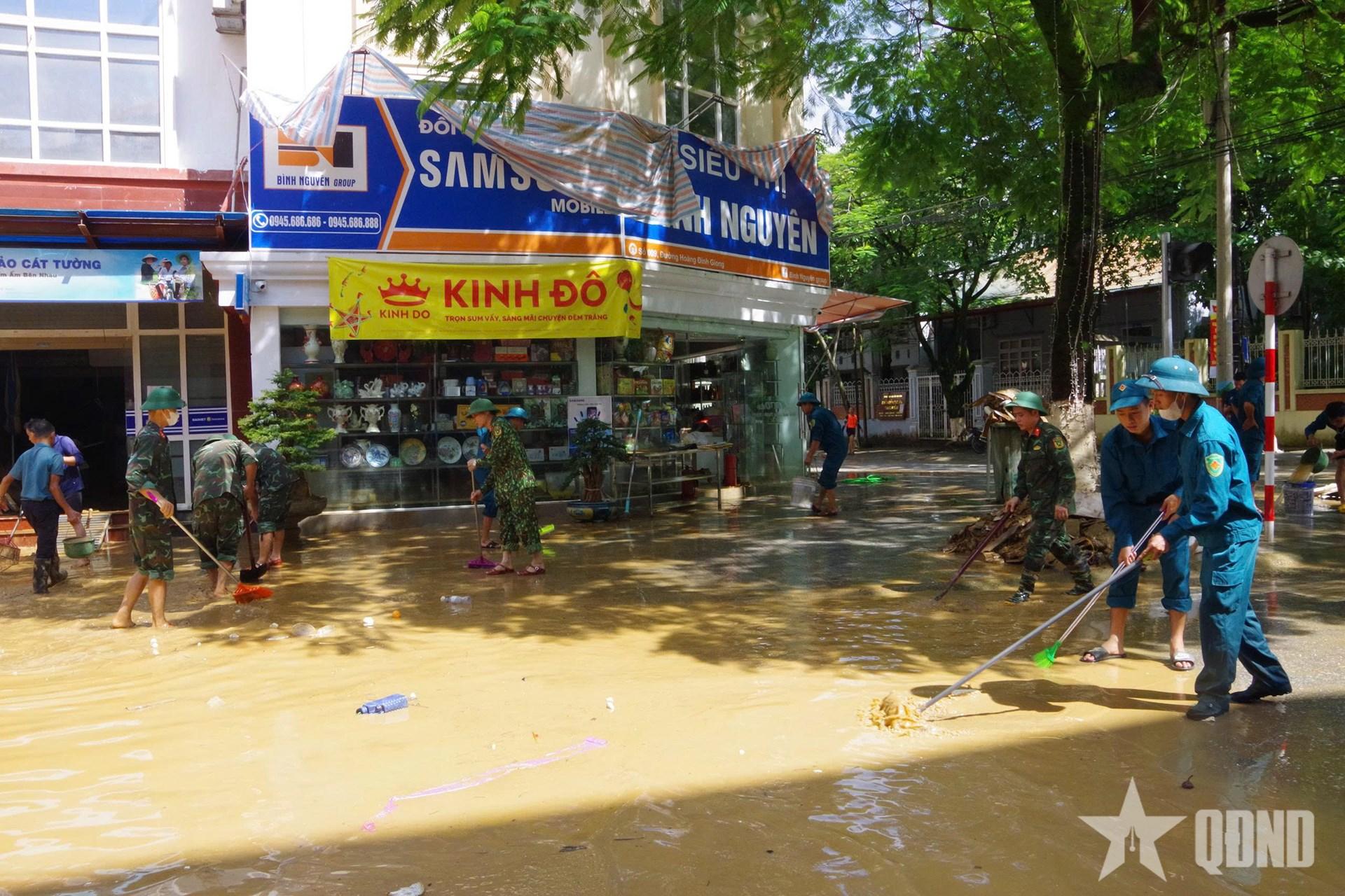 Sáng nay (8-10), Bộ CHQS tỉnh Cao Bằng đã huy động hơn 150 cán bộ, chiến sĩ, Bộ đội Biên phòng dọn dẹp bùn đất tại các tuyến phố chính của phường Thục Phán. Với phương châm nước rút đến đâu dọn ngay tới đó, không để bùn đất ùn ứ, các lực lượng đã tới từng nhà dân và cửa hàng kinh doanh giúp dọn dẹp bùn đất, khơi thông cống rãnh, tổng dọn vệ sinh.