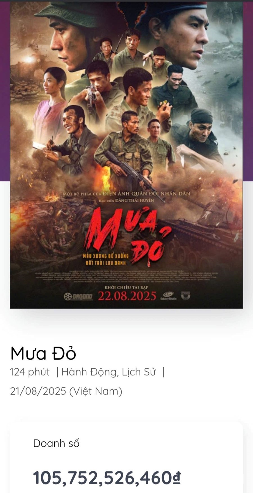 Doanh số phòng vé phim "Mưa đỏ" tính đến 8 giờ, ngày 25-8. |