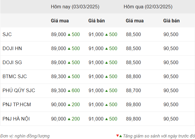 Phiên sáng ngày 3/3, giá vàng miếng SJC được hầu hết các doanh nghiệp điều chỉnh tăng 500.000 - 600.000 đồng/lượng, hiện giá mua vào đứng ở mức 89 triệu đồng/lượng, bán ra 91 triệu đồng/lượng.