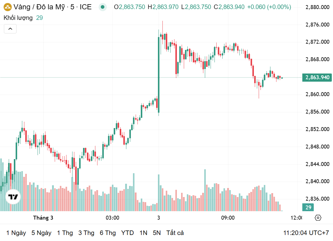 Trên thị trường quốc tế, cập nhật thời điểm 10h30 ngày 3/3 (giờ Việt Nam), giá vàng thế giới ở mức 2.964 USD/ounce, tăng 20,37 USD so với phiên trước. Quy đổi theo tỷ giá Vietcombank, giá vàng hiện đạt 89 triệu đồng/lượng (đã bao gồm thuế, phí). Như vậy, nếu so với giá vàng miếng SJC bán ra là 91 triệu đồng/lượng, thì chênh lệch giữa giá vàng trong nước và giá vàng thế giới khoảng 2 triệu đồng/lượng.