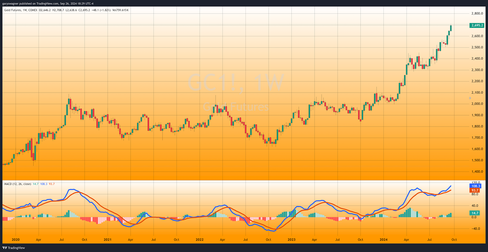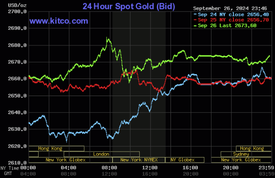 Hôm qua (ngày 26/9), giá vàng thế giới đóng cửa ở mức 2.681,20 USD và mở cửa sáng nay ở mức 2.695,10 USD, ghi nhận mức tăng đáng kể là 13,80 USD (tương đương 0,51%). Sau một số biến động, giá vàng tăng vọt lên mức 2.708,70 USD/ounce - chính thức cán mốc lịch sử. Theo Kitco, mức giá chưa từng có này cho thấy sức hấp dẫn lâu dài của vàng như một tài sản trú ẩn an toàn, đồng thời nhấn mạnh giá trị nội tại của vàng nhưng lại gây "xói mòn" niềm tin của thị trường vào các loại tiền pháp định.