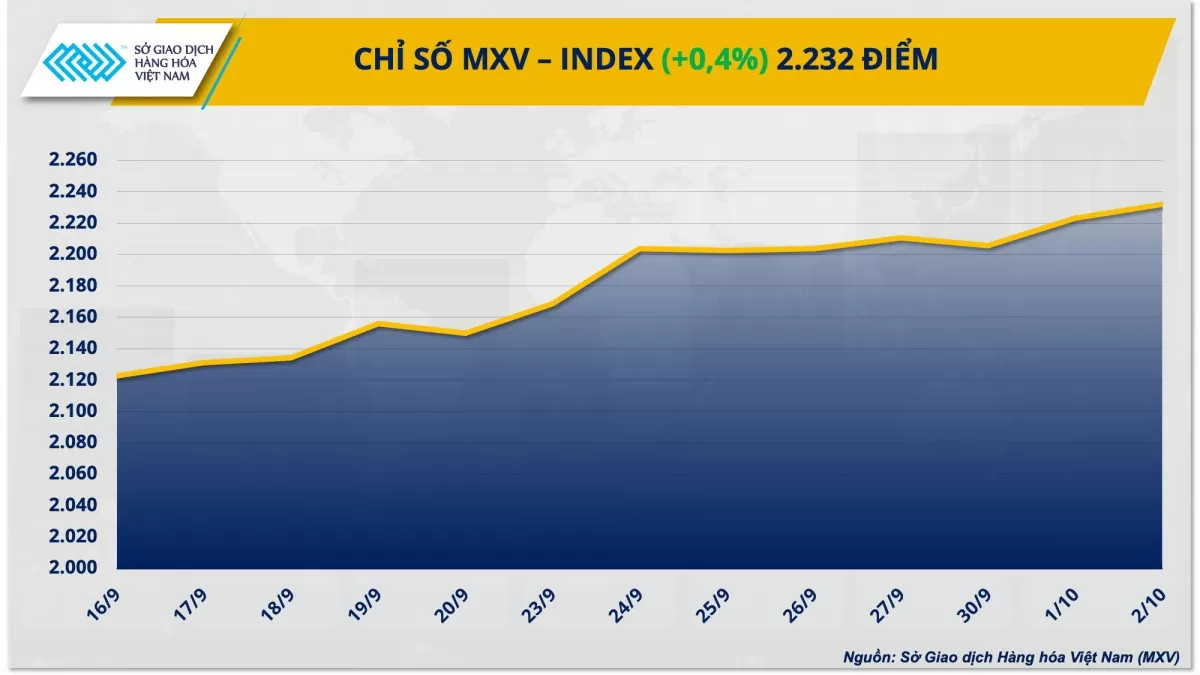 Lực mua chiếm ưu thế trên thị trường hàng hóa nguyên liệu thế giới trong phiên giao dịch ngày hôm qua (2/10) kéo chỉ số MXV-Index tăng nhẹ 0,4% lên 2.232 điểm.