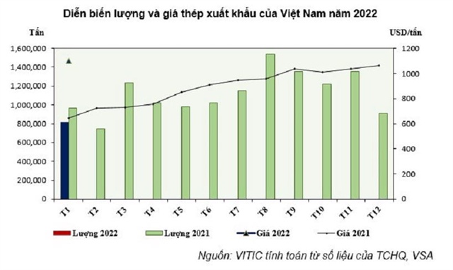 Về tình hình xuất khẩu, tháng 1/2022, xuất khẩu thép thành phầm của Việt Nam đạt 815 ngàn tấn, giảm 10,28% so với tháng trước và giảm 15,8% so với cùng kì năm 2021. Trị giá xuất khẩu đạt 896 nghìn USD, giảm 7,11% so với tháng 12/2021 nhưng tăng 43,79% so với cùng kỳ năm 2021.