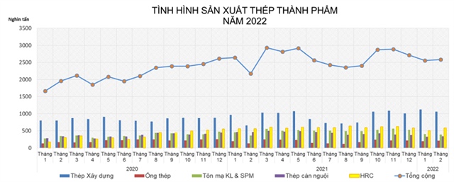 Tính chung 2 tháng đầu năm 2022, sản xuất thép thành phẩm đạt 5,117 triệu tấn, tăng 1,6% so với cùng kỳ năm 2021. Tiêu thụ thép thành phẩm đạt 5,014 triệu tấn, tăng 18,5% so với cùng kỳ năm 2021. Trong đó xuất khẩu đạt 126.017 tấn, tăng 11,6% so với cùng kỳ năm ngoái.