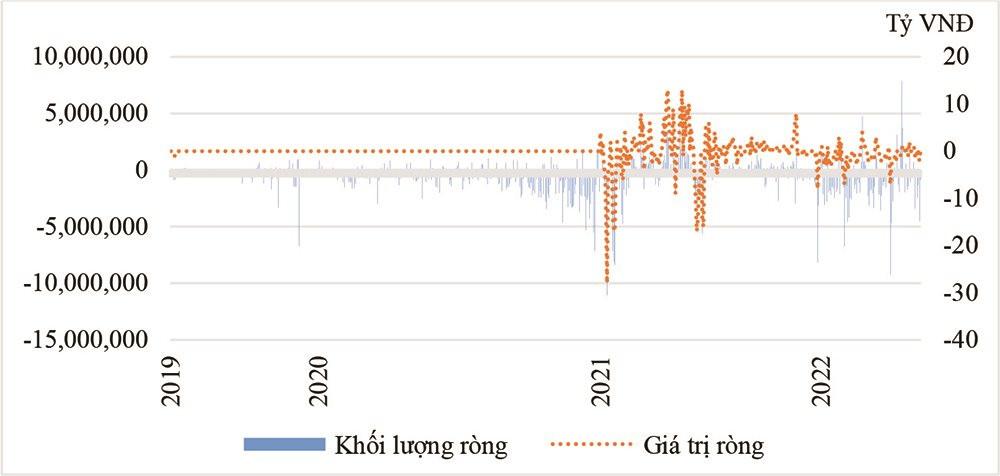 Giao dịch của chứng quyền có bảo đảm cũng tăng trưởng mạnh vào cuối năm 2021 và ấn tượng hơn vào tháng 5/2022 (Hình 6). Mặc dù khối lượng giao dịch và giá trị giao dịch chứng quyền có bảo đảm mặc dù bị giảm mạnh vào tháng 6, tháng 7/2021 do ảnh hưởng chung của dịch bệnh vào thời điểm đó và tháng 3/2022 nhưng trên đà phục hồi trở lại vào tháng 5/2022. Giá trị giao dịch cũng như khối lượng giao dịch ròng của nhà đầu tư nước ngoài đối với chứng quyền kinh doanh cũng bị ảnh hưởng nhiều trong năm 2021 và tháng 3/2022, nhưng nhìn chung có sự tăng trưởng về con số này so với lúc mới đi vào hoạt động (Hình 7).