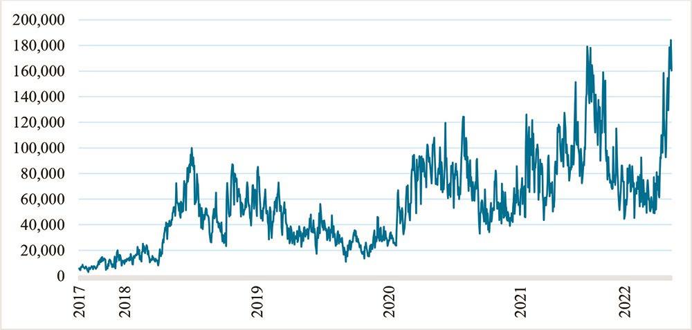Tương tự như vậy, tổng lệnh mua và bán của các nhà đầu tư đạt cao nhất vào đầu năm 2022 mặc dù có sự sụt giảm khá mạnh vào tháng 3 (Hình 2). Tính từ khi mới đi vào hoạt động năm 2017, số lệnh chỉ đạt mức 6.782, nhưng đến tháng 5/2022 đã đạt đến 178.624 lệnh, gấp 26 lần so với năm 2017. Mặc dù giảm nhiều vào tháng 9/2021 và tháng 3/2022 so với mức tăng trước đó do ảnh hưởng của đợt dịch COVID-19 thứ 4 tại Việt Nam và bất ổn của thị trường trên thế giới, nhưng số lượng lệnh mua và bán hàng ngày vẫn khá cao và đang trên đà phục hồi tốt. Ngoài ra, có thể thấy tín hiệu tương tự đối với sự thay đổi trong giao dịch các nhà đầu tư nước ngoài (Hình 3), thời gian gần đây trong năm 2022, giao dịch các nhà đầu tư nước ngoài tăng nhiều so với năm 2020 và những năm trước đây khi thị trường mới đi vào hoạt động vào năm 2017.