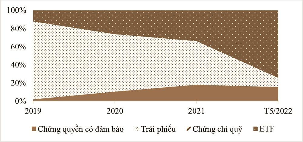 Hình 4: Cơ cấu về khối lượng giao dịch của một số chứng khoán trên sàn giao dịch HOSE (chưa tính cổ phiếu) giai đoạn 2017-t5/2022