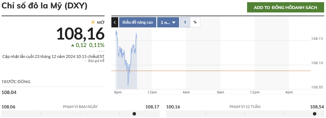 Cùng thời điểm, trên thị trường thế giới, chỉ số USD Index (DXY) - thước đo sức mạnh của đồng USD so với các đồng tiền chủ chốt khác - ở mức 108,16 điểm, tăng 0,11% so với phiên trước.