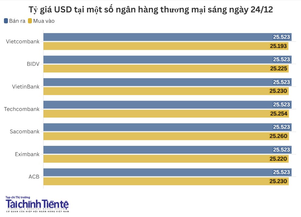 Giá mua - bán đồng bạc xanh tại các ngân hàng được điều chỉnh theo xu hướng giảm 5 - 7 đồng so với chốt phiên ngày 23/12. Giá mua thấp nhất đang ở mức 25.193 VND/USD, giá mua cao nhất ở mức 25.260 VND/USD. Giá bán ra được hầu hết các ngân hàng niêm yết ở mức 25.523 VND/USD.