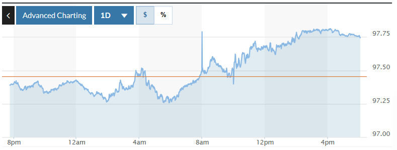 Trong khi đó, trên thị trường Mỹ, chỉ số US Dollar Index (DXY) đo lường biến động đồng bạc xanh với 6 đồng tiền chủ chốt (EUR, JPY, GBP, CAD, SEK, CHF) tăng 0,30%, hiện ở mức 97,74.