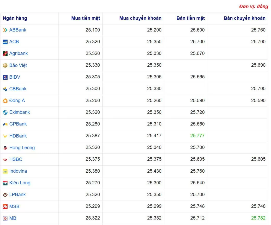Ngân hàng HDBank đang bán tiền mặt USD với giá cao nhất là: 1 USD = 25.777 VND