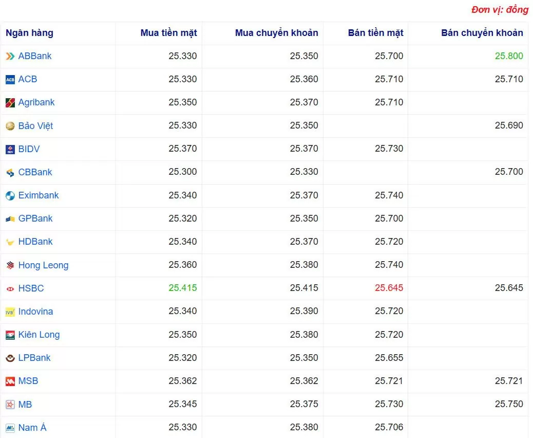 Ngân hàng VietBank đang bán chuyển khoản USD với giá thấp nhất là: 1 USD = 25.600 VND