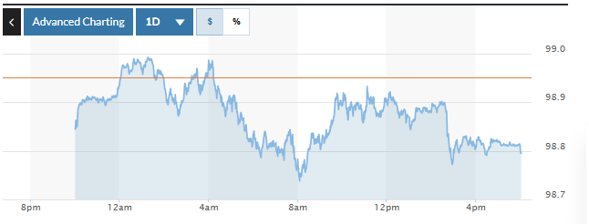 Trong khi đó, trên thị trường Mỹ, chỉ số US Dollar Index (DXY) đo lường biến động đồng bạc xanh với 6 đồng tiền chủ chốt (EUR, JPY, GBP, CAD, SEK, CHF) giảm 0,15%, hiện ở mức 98,80.