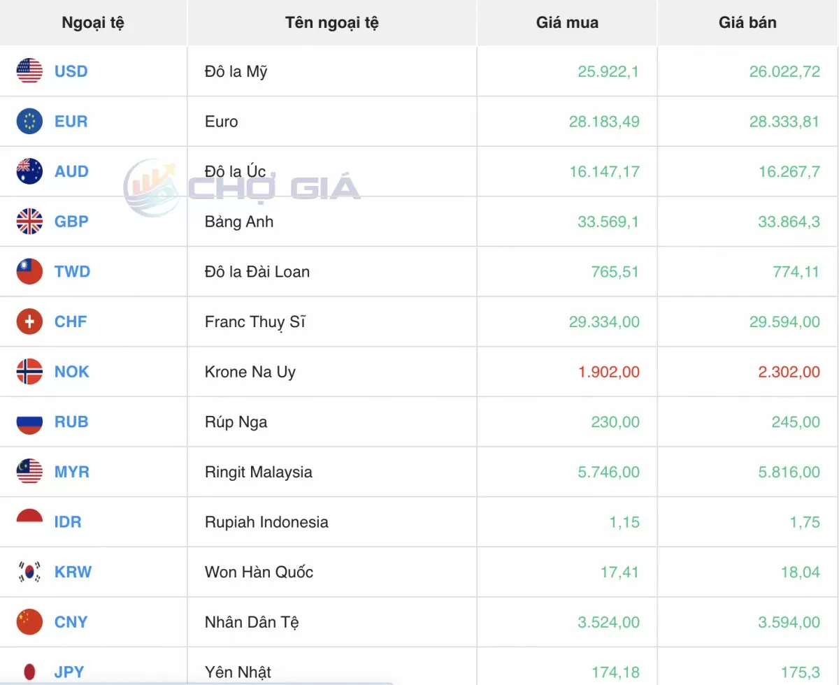 | Franc Thụy Sỹ | CHF | 29,245 | 29,274 | 30,095 |