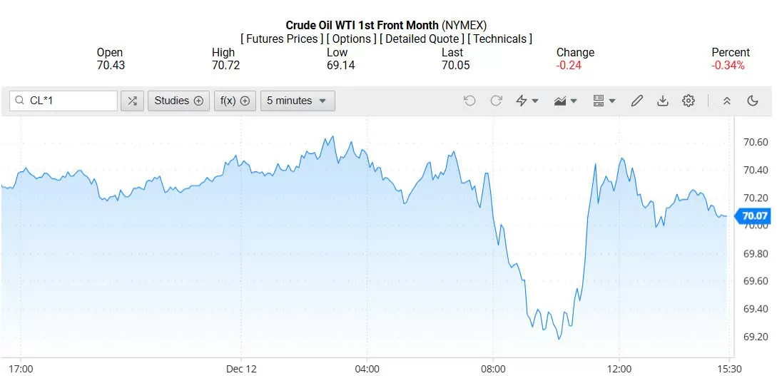 Ghi nhận trên Oilprice lúc 4h30 ngày 13/12/2024 (theo giờ Việt Nam), giá dầu WTI ở mốc 70,07 USD/thùng, giảm 0,34% (tương đương giảm 0,24 USD/thùng).