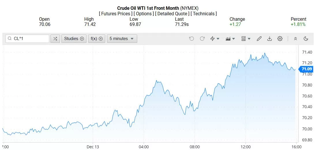 Ghi nhận trên Oilprice lúc 4h30 ngày 15/12/2024 (theo giờ Việt Nam), giá dầu WTI ở mốc 71,09 USD/thùng, tăng 1,81% (tương đương tăng 1,27 USD/thùng).