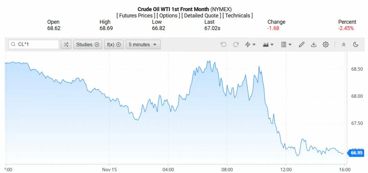 Ghi nhận trên Oilprice lúc 5h ngày 18/11/2024 (theo giờ Việt Nam), giá dầu WTI ở mốc 66,95 USD/thùng, giảm 2,45% (tương đương giảm 1,68 USD/thùng).