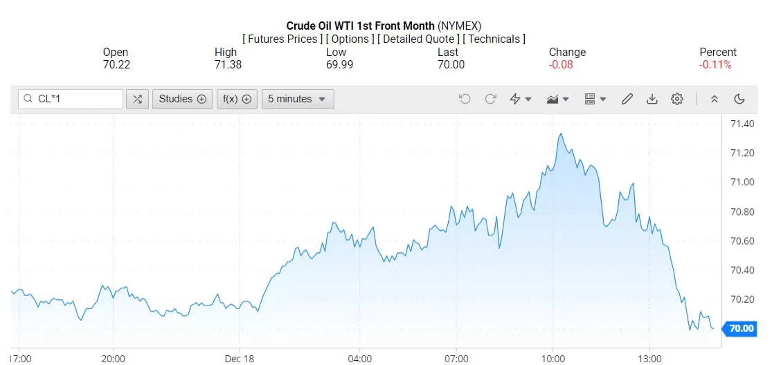 Ghi nhận trên Oilprice lúc 4h30 ngày 19/12/2024 (theo giờ Việt Nam), giá dầu WTI ở mốc 70,00 USD/thùng, giảm 0,11% (tương đương giảm 0,08 USD/thùng).