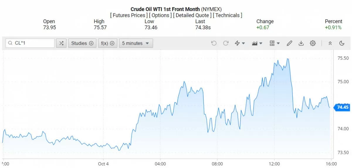 Ghi nhận trên Oilprice lúc 5h ngày 5/10/2024 (theo giờ Việt Nam), giá dầu WTI ở mốc 74,45 USD/thùng, tăng 0,91% (tương đương tăng 0,67 USD/thùng).