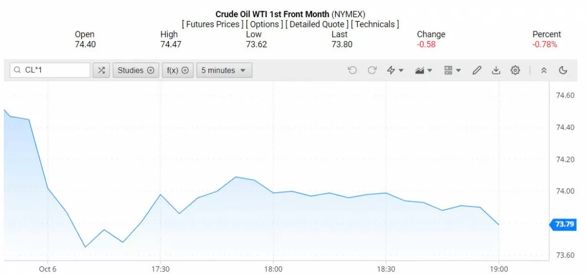 Ghi nhận trên Oilprice lúc 5h ngày 7/10/2024 (theo giờ Việt Nam), giá dầu WTI ở mốc 73,79 USD/thùng, giảm 0,78% (tương đương giảm 0,58 USD/thùng).
