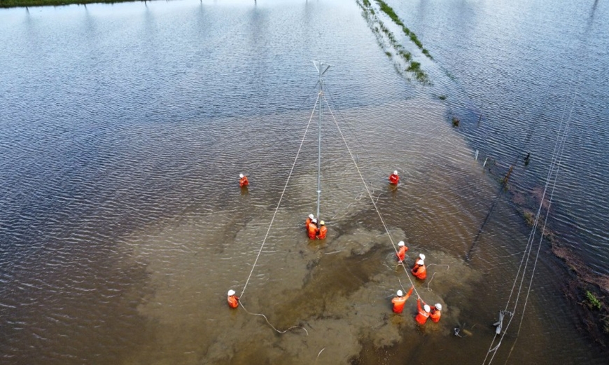 Nhân viên điện lực miền Bắc dầm mình dưới nước dựng cột, kéo dây khắc phục sự cố lưới điện. Ảnh: PHƯƠNG ANH |