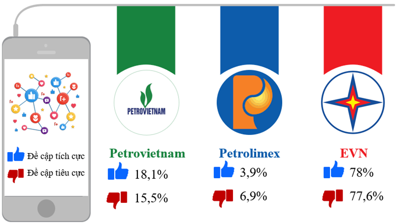 Đối với phương diện cảm nhận của công chúng, EVN ghi nhận tỷ lệ đề cập tích cực cao 78% nhưng đồng thời cũng có tỷ lệ đề cập tiêu cực 77,6%, cho thấy thương hiệu có sự hiện diện mạnh mẽ, song vẫn còn nhiều ý kiến chưa hài lòng. Petrovietnam duy trì sự ổn định với 18,1% đề cập tích cực và 15,5% đề cập tiêu cực, thể hiện mức độ tin cậy bền vững nhưng chưa tạo được đột phá trong đánh giá từ công chúng. Đáng chú ý, Petrolimex lại ghi nhận mức đề cập tích cực 3,9% và tiêu cực 6,9%, phản ánh sức bật truyền thông còn hạn chế và nguy cơ tụt hậu so với các đối thủ khác trên mặt trận truyền thông của ngành năng lượng.