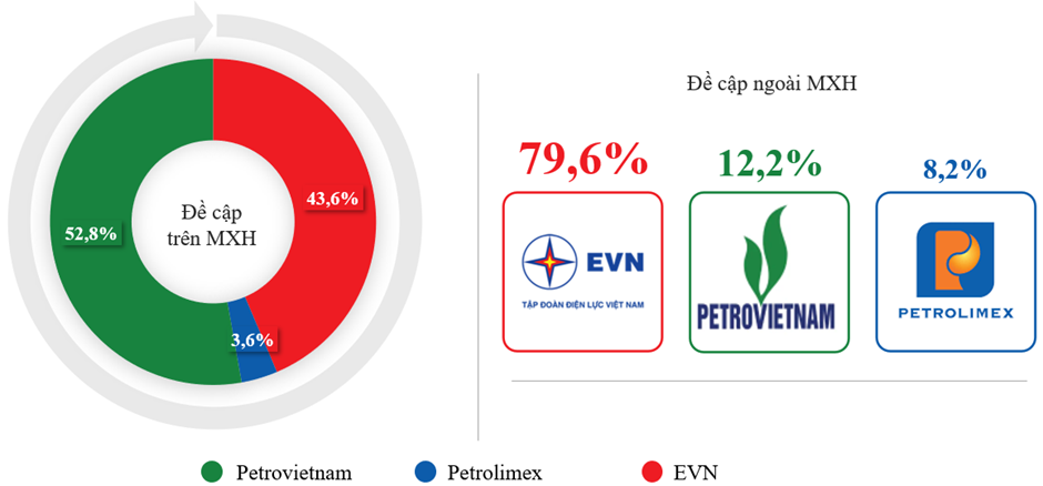 Xét theo kênh truyền thông, EVN chiếm ưu thế vượt trội với 79,6% tổng lượng đề cập ngoài mạng xã hội (MXH) và 43,6% tổng lượng đề cập trên MXH, cho thấy khả năng duy trì độ phủ tốt và có sự kết hợp hiệu quả giữa các kênh truyền thông. Mặt khác, Petrovietnam lại ghi dấu ấn mạnh mẽ trên MXH khi đạt tới 52,8% tổng lượng đề cập, trong khi tỷ lệ ngoài MXH chỉ đạt 12,2%, phản ánh định hướng ưu tiên thúc đẩy truyền thông trên MXH của Tập đoàn. Đối với Petrolimex, lượng đề cập trên các kênh vẫn ở mức khiêm tốn, tỷ lệ đề cập ngoài MXH chỉ đạt 8,2% và tỷ lệ đề cập trên MXH là 3,6%, kết quả này cho thấy Petrolimex cần tăng cường các hoạt động truyền thông trên đa kênh nhằm mở rộng phạm vi tiếp cận và nâng cao mức độ tương tác với công chúng.