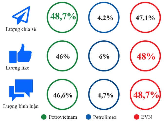 Dữ liệu cho thấy EVN và Petrovietnam đang duy trì vị thế cân bằng về số lượt tương tác trên mạng xã hội, khi EVN chiếm 47,1% lượng chia sẻ, 48% lượt like và 48,7% lượng bình luận, trong khi Petrovietnam đạt lần lượt 48,7% lượng chia sẻ, 46% lượt like và 46,6% lượng bình luận. Điều này phản ánh khả năng thu hút sự chú ý và duy trì tương tác ổn định với công chúng của cả hai thương hiệu. Ở chiều ngược lại, Petrolimex chỉ đạt 4,2% lượng chia sẻ, 6% lượt like và 4,7% lượng bình luận, cho thấy Petrolimex cần đầu tư mạnh hơn vào nội dung sáng tạo và phương thức kết nối linh hoạt để nâng cao mức độ lan tỏa trên các nền tảng mạng xã hội.