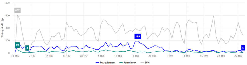 Về tổng lượng đề cập, EVN dẫn đầu khi chiếm tới 68,4% tổng lượng đề cập, vượt xa Petrovietnam với 24,9% và Petrolimex với 6,7%. Kết quả này cho thấy chiến lược truyền thông ổn định và có chiều sâu của EVN, tập trung vào các chủ đề như chuyển đổi số ngành điện, tối ưu hạ tầng và minh bạch giá điện. Bên cạnh đó, Petrovietnam cũng duy trì sự hiện diện tương đối ổn định thông qua các nội dung về năng lượng sạch và công nghệ mới, trong khi Petrolimex vẫn được nhắc đến chủ yếu trong các bản tin về điều hành giá và thị trường xăng dầu.