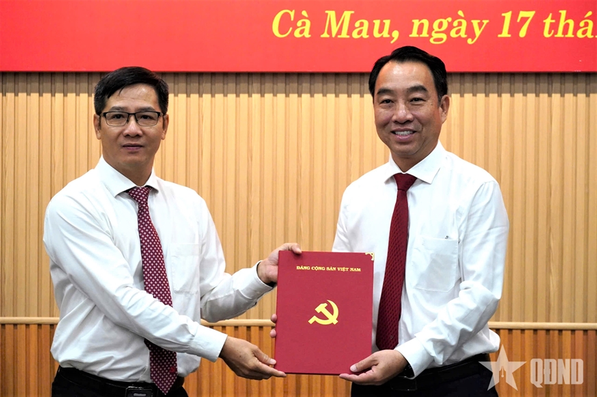 Đồng chí Nguyễn Thành Tâm (bên trái), Ủy viên Trung ương Đảng, Phó trưởng ban Tổ chức Trung ương trao quyết định cho đồng chí Lữ Quang Ngời giữ chức Phó bí thư Tỉnh ủy Cà Mau. |