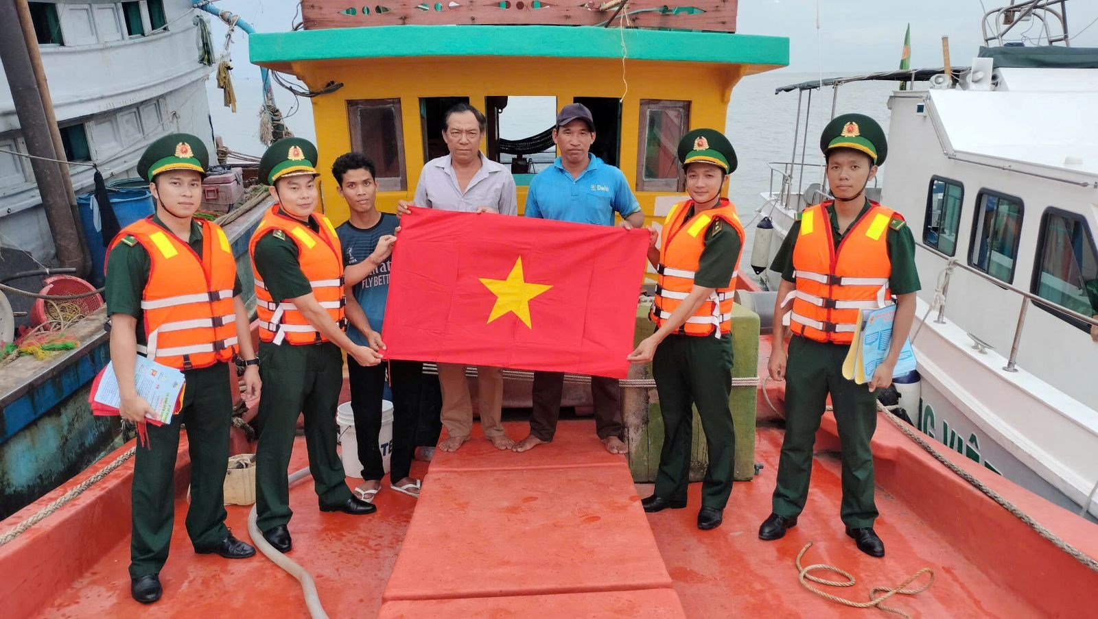 Cán bộ, chiến sĩ Đồn Biên phòng Sông Đốc tuyên truyền pháp luật và tặng cờ Tổ quốc cho ngư dân. |