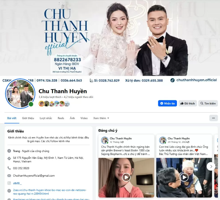 Trong khi đó, fanpage “Facebook.com/chuthanhhuyen.vn” vẫn thường xuyên đăng tải các bài viết, video liên quan tới bà Chu Thanh Huyền, cầu thủ Quang Hải và gia đình; cũng như hoạt động quảng cáo, giới thiệu các sản phẩm.