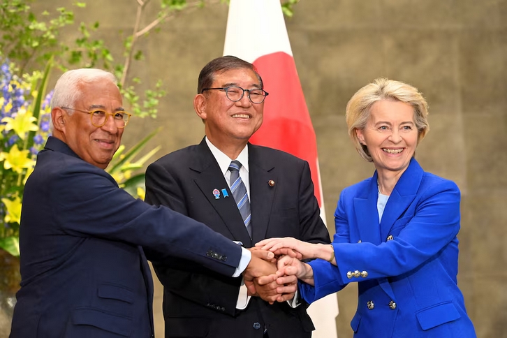 | Chủ tịch Hội đồng châu Âu António Costa (ngoài cùng, bên trái), Chủ tịch Ủy ban châu Âu Ursula von der Leyen (ngoài cùng, bên phải) và Thủ tướng Nhật Bản Ishiba Shigeru tại Tokyo, ngày 23-7. Ảnh: Reuters |