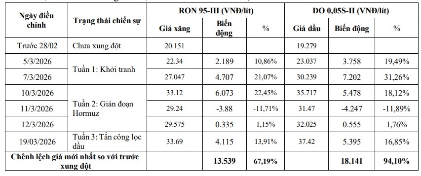 * Tại Việt Nam, tính đến ngày 19-3, sau 3 tuần giao tranh, giá xăng dầu trong nước được điều chỉnh 6 lần, mức điều chỉnh cuối cùng tăng 67,19% so với xăng và 94,10% do với dầu DO.
