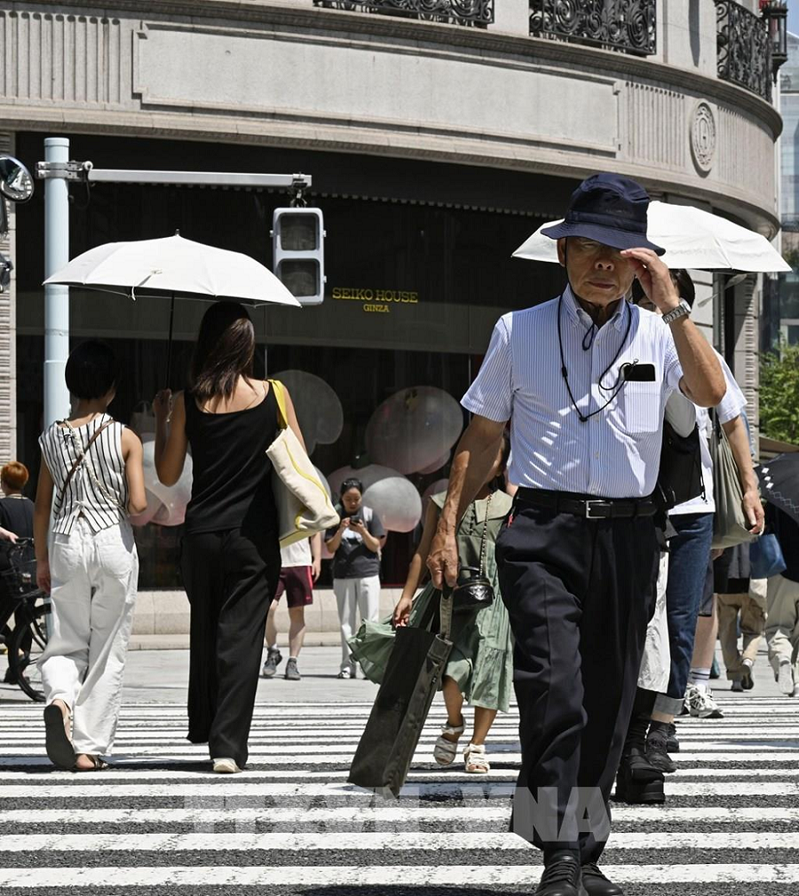 Người dân di chuyển dưới trời nắng gay gắt tại Tokyo, Nhật Bản ngày 27/8/2025