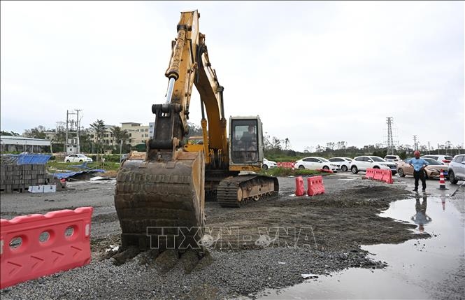 Sửa chữa đoạn đường bị hư hại do bão Ragasa tại tỉnh Quảng Đông, Trung Quốc ngày 25-9. |