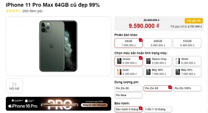 Cuối tháng 9, khách Việt có thể sở hữu iPhone 11 Pro Max bản 64GB cũ đẹp 64GB với giá từ 9.59 triệu đồng. Theo quảng cáo máy có ngoại hình đẹp như mới và pin % cao. Trong khi đó bản 256GB gấp 4 lần dung lượng có giá đắt hơn không nhiều từ 10.29 triệu đồng. Mức giá này tương đương iPhone 11 bản 128GB.