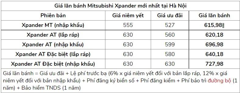Xe Giao thông sẽ tính giá lăn bánh Mitsubishi Xpander tại Hà Nội dựa trên các loại thuế, phí mà chủ xe phải trả để ra được biển số. Tại các địa phương khác, giá lăn bánh sẽ thấp hơn.