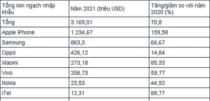 Xếp sau Apple trong danh mục nhập khẩu điện thoại nguyên chiếc là Samsung với 863 triệu USD, Oppo 426 triệu USD và Xiaomi 273 triệu USD. Một số thương hiệu khác như Vivo, Nokia, Itel, Masstel, Asus, Sony, Motorola cũng có mặt trong danh sách nhưng kim ngạch khá khiêm tốn.