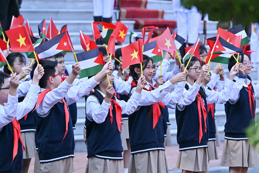 Các cháu thiếu nhi Thủ đô có mặt tại Phủ Chủ tịch vẫy cờ hai nước chào đón Quốc vương Abdullah II Ibn Al Hussein cùng Đoàn cấp cao Jordan.