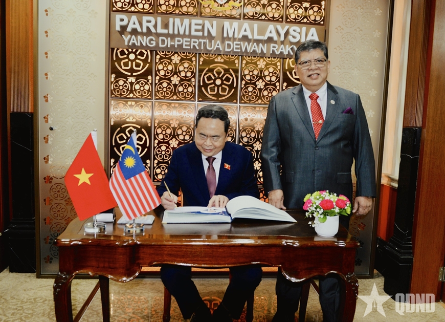| Chủ tịch Quốc hội Trần Thanh Mẫn ghi sổ lưu niệm tại trụ sở Hạ viện Malaysia. |