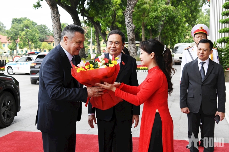 | Chủ tịch Quốc hội Trần Thanh Mẫn đón Chủ tịch Hạ viện Uzbekistan Nuriddin Ismoilov. |