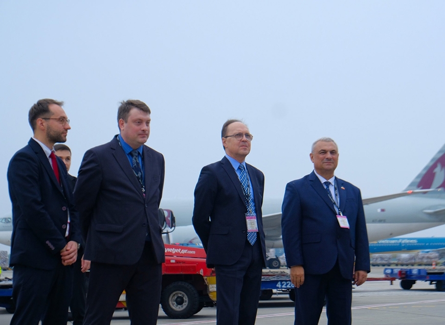 Buổi bàn giao hàng viện trợ diễn ra tại khu vực sân bay Nội Bài, với sự tham dự của Đại sứ Liên bang Nga tại Việt Nam Gennady Bezdetko; ông Nguyễn Trường Sơn, Phó cục trưởng Cục Quản lý đê điều và Phòng, chống thiên tai (Bộ Nông nghiệp và Môi trường).