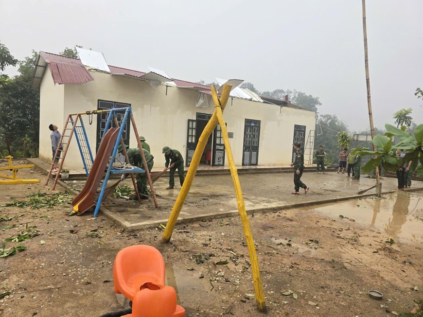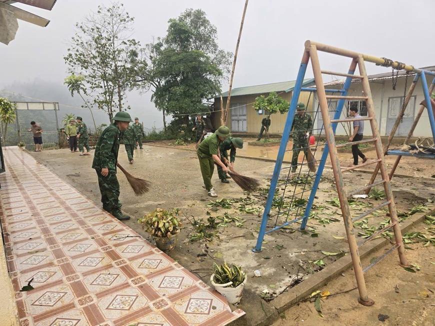 Lực lượng vũ trang trên địa bàn giúp người dân khắc phục hậu quả sau trận lốc xoáy. Ảnh: Xã Na Sang cung cấp