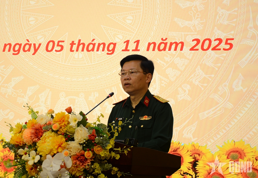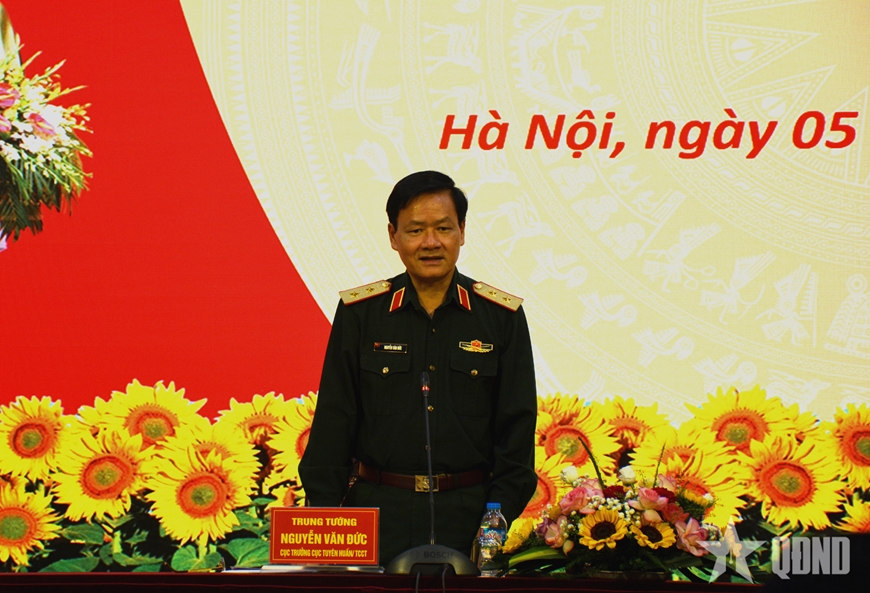 Trung tướng Nguyễn Văn Đức, Cục trưởng Cục Tuyên huấn, Tổng cục Chính trị Quân đội nhân dân Việt Nam chủ trì gặp mặt báo chí.