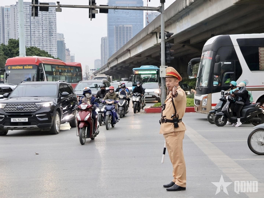 | Đội Cảnh sát giao thông đường bộ số 6 điều tiết giao thông tại đường Phạm Hùng - Đại lộ Thăng Long. |