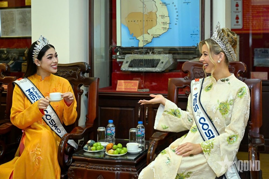| Báo Quân đội nhân dân là cơ quan báo chí đầu tiên tại Việt Nam đón Top 2 Miss Cosmo đến thăm, gặp gỡ, giao lưu. |