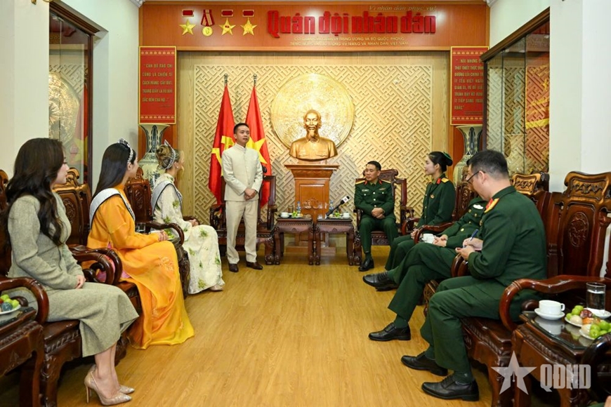 Tại buổi gặp mặt, Đại tá Ngô Anh Thu, Phó bí thư Đảng ủy, Phó tổng biên tập giới thiệu với hai người đẹp về truyền thống, lịch sử hơn 75 năm của báo QĐND. Báo QĐND là cơ quan báo chí hàng đầu trong hệ thống báo chí của Việt Nam, với các sản phẩm báo in được phát hành rộng rãi trong cả nước và báo điện tử với phiên bản tiếng Việt và 5 phiên bản ngoại ngữ: Tiếng Anh, tiếng Trung, tiếng Lào, tiếng Khmer, tiếng Nga. Báo có nhiệm vụ tuyên truyền về mọi mặt đời sống xã hội, trong đó trọng tâm là lĩnh vực quốc phòng, an ninh. Tờ báo theo đuổi tôn chỉ, mục đích nhân văn, khách quan, trung thực, đồng hành cùng sự phát triển của Quân đội, sự lớn mạnh của đất nước.